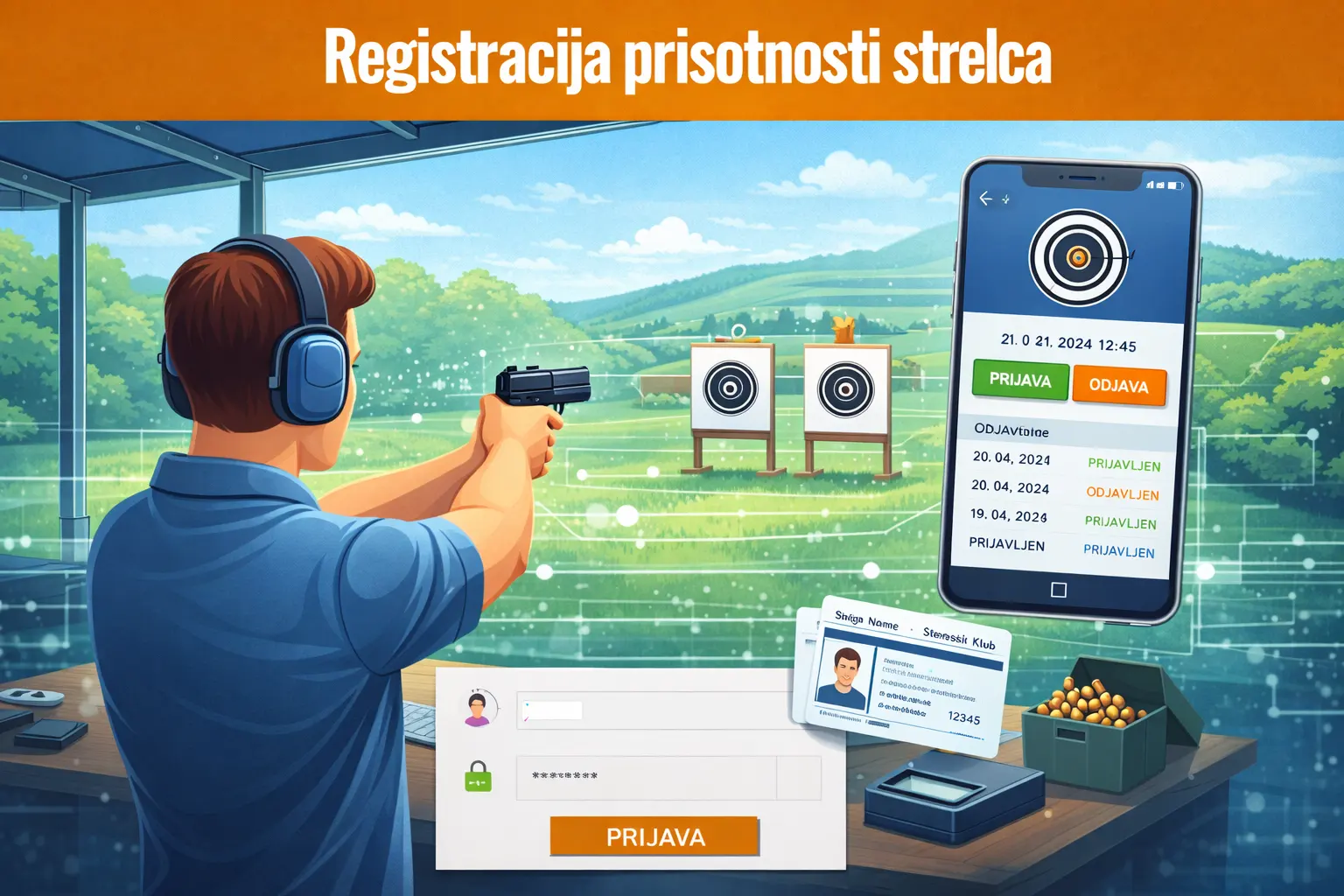 Aplikacija omogoča enostavno in zanesljivo registracijo prisotnosti strelcev na športnem strelišču. Prijava in odjava se izvajata digitalno, preko mobilne ali namizne naprave, kar zagotavlja natančen pregled nad uporabo strelišča in prisotnostjo članov.